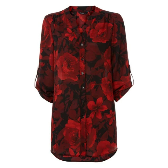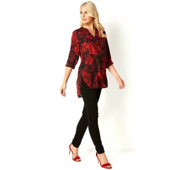 3/4 Sleeve Rose Print Floral Button Up Blouse from Roman. Fall in love with romantic prints in hues of deep reds. Adorned in an all-over rose floral print, this beautiful blouse features 3/4 sleeves and button through fastening.