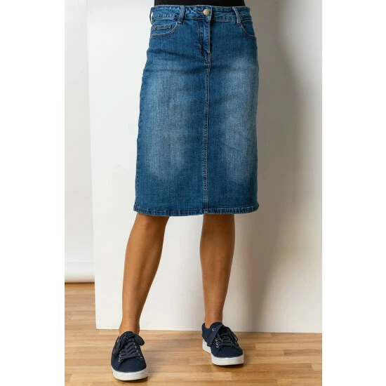 A Line Stretch Denim Skirt from Roman. Look cool and chic all day long with our versatile bleach wash skirt, taking you from dusk til dawn. Made from a stretch woven denim, this A-line skirt is fastened with a front zip and stud featuring cute front pocket details. Pair with your everyday wardrobe staples or wear out on the town with heels and statement jewellery for a casual take on an evening out look.