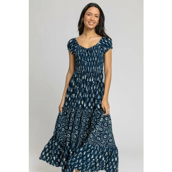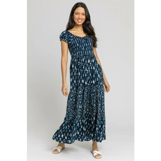 Aztec Tie Detail Tiered Maxi Dress from Roman. This Aztec print dress is perfect for a day out this summer. Featuring contrasting aztec prints and tie dye detailing, this patchwork dress will make you look stylish yet elegant all day long, whether it’s a picnic in the park or a beach side stroll. Finished with a frilly hem and loose v neckline, this day dress is ideal for a relaxed silhouette on your next holiday.