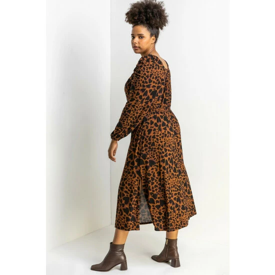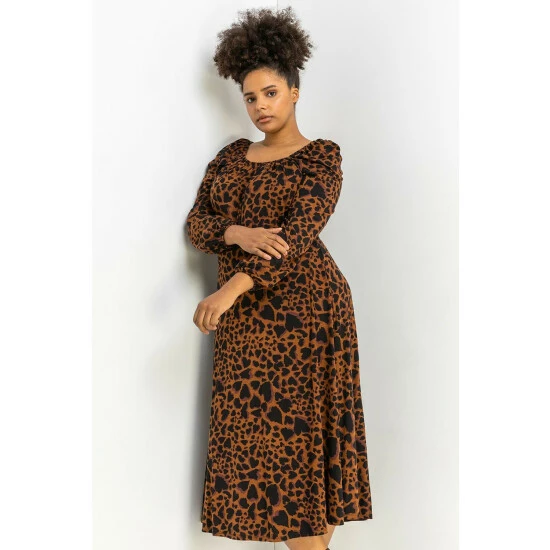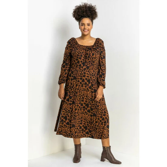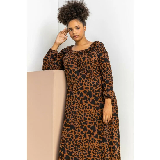 Curve Animal Print Midi Dress from Roman. Freshen up your autumn-winter wardrobe with this animal print midi dress. Cut from a super comfy stretch jersey fabric, this long sleeve dress has a square neckline that will make a flattering and wearable addition to your everyday collection. Our floaty and feminine piece can be worn with your favourite work flats on a weekday and paired with boots for the weekend.