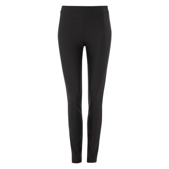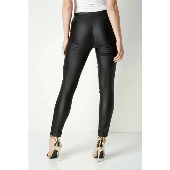 Faux Leather Pull On Stretch Trousers from Roman. Give your look a fierce touch with these trousers. Featuring a black faux leather fabric and a slim fit, these pull-on stretch trousers are perfect with strappy heels and a cute top.