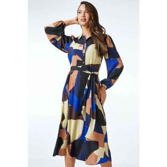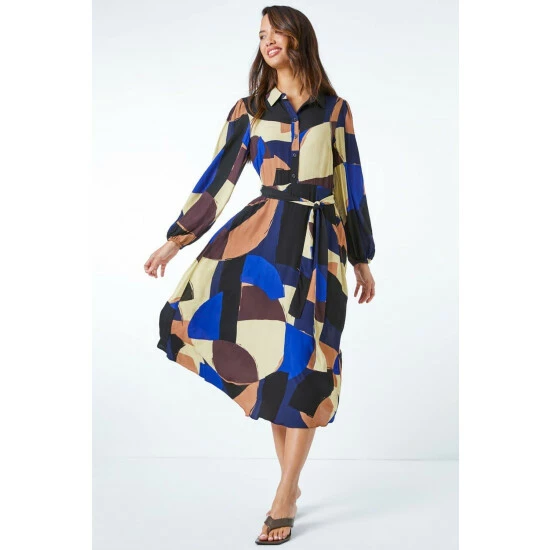 Geo Print Belted Shirt Dress from Roman. A seriously stylish shirt dress and statement print is just about perfect for this time of year. This midi length shirt dress is the full package with long elasticated sleeves, metallic button fastening and waist cinching belt details. Colourblocked with a bold abstract print, this floaty a-line number can transition you between seasons with ease. Style this shirt collar midi with a black handbag and heels to effortlessly take you from desk to dinner in a flash!