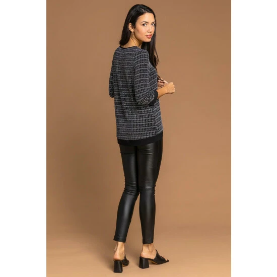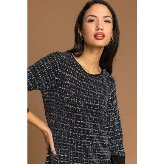 Shimmer Check Asymmetric Top from Roman. Crafted from a shimmering check print fabric and a soft stretch jersey inner, this sparkling style is a real festive staple. A contrast trim detail and wrap over silhouette makes this style so flattering on the figure. Pair with faux leather leggings and heels for a night on the town or dress it with some comfy jeggings for an evening meal!