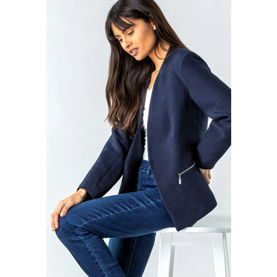 Zip Detail Pleated Jacket from Roman. Step up your style game and complete your look with this zip detail tailored jacket. Cut from a beautiful textured fabric, this long sleeve jacket is tailored with pleats to flatter your silhouette and layers beautifully over any outfit. Fully lined and finished with stylish zip detail mock pockets, this jacket is ideal for keeping things stylish at the office with smart trousers and a nice top or for draping over an evening dress when you’re heading out on the town.